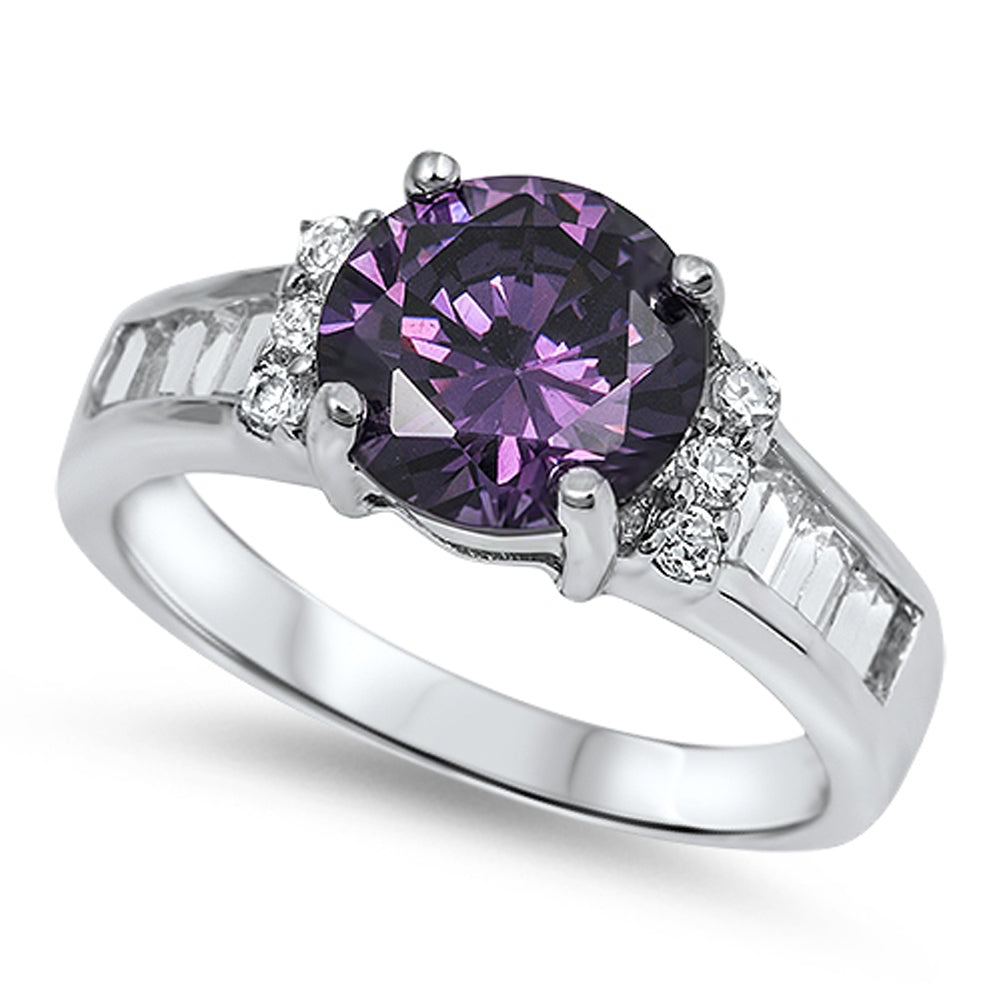Amethyst CZ Round Solitaire Polished Ring .925 Sterling Silver Band Sizes 5-10