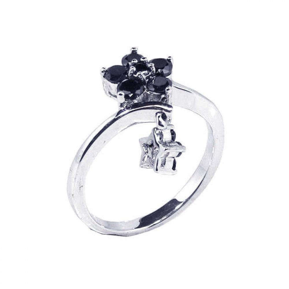 Sterling Silver 925 Rhodium Plated Black CZ Dangling Flower Ring Band Sizes 5-9